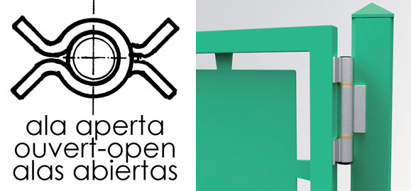 Scharnier und 3 offene Flügel für Eisentore der Marke IBFM mit abnehmbarem Stift.