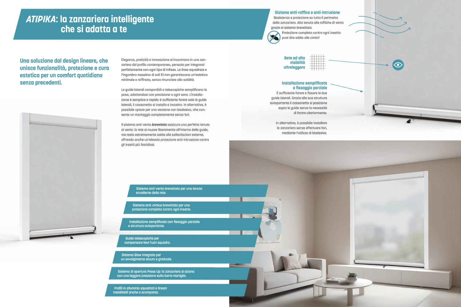 ATIPIKA Effezeta – Intelligentes, vertikales Moskitonetz mit patentiertem wind- und bettwanzensicherem System, Öffnung per Druckknopf und Reibungsmechanismus. Eine lineare Designlösung, die Funktionalität, Schutz und Ästhetik für unvergleichlichen Komfort im Alltag vereint.