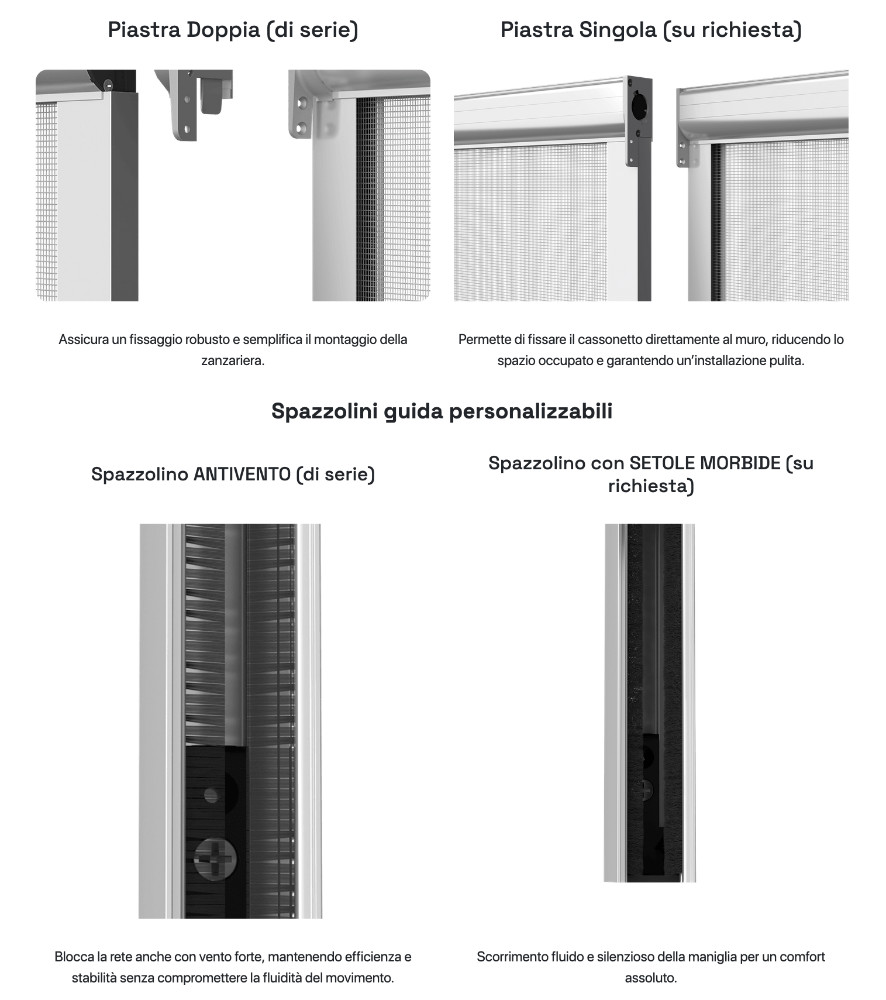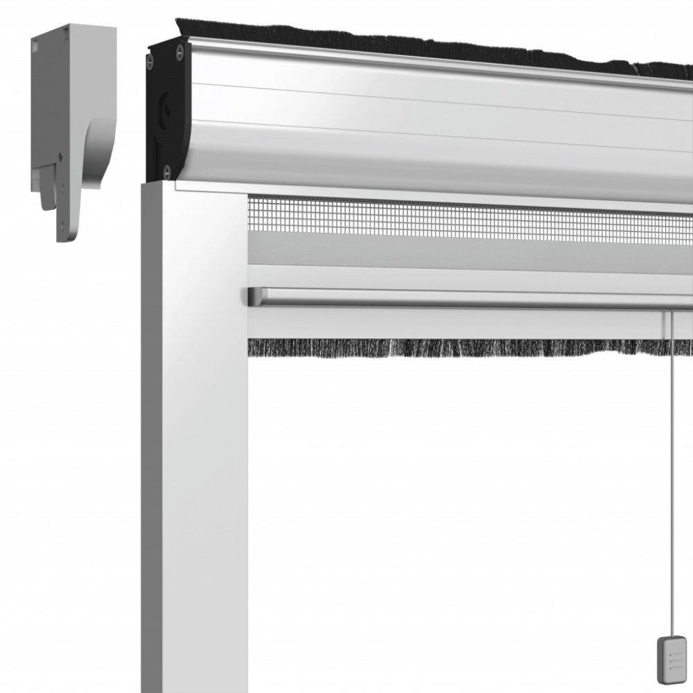 Die seitlichen Führungsschienen mit windfesten Bürsten (Standard) halten das Netz auch bei Wind sicher an seinem Platz, ohne dessen Leichtgängigkeit zu beeinträchtigen. Für ein noch leiseres und sanfteres Gleiten ist optional eine Bürste mit weichen Borsten erhältlich.