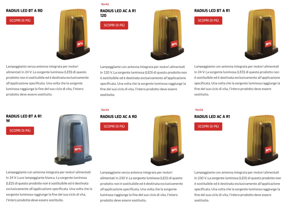 Die LED-Blinkleuchte BFT RADIUS ist die offizielle Lichtanzeige für automatische Tor- und Türantriebe und ist in 6 Varianten erhältlich, um sich an jeden Systemtyp anzupassen.