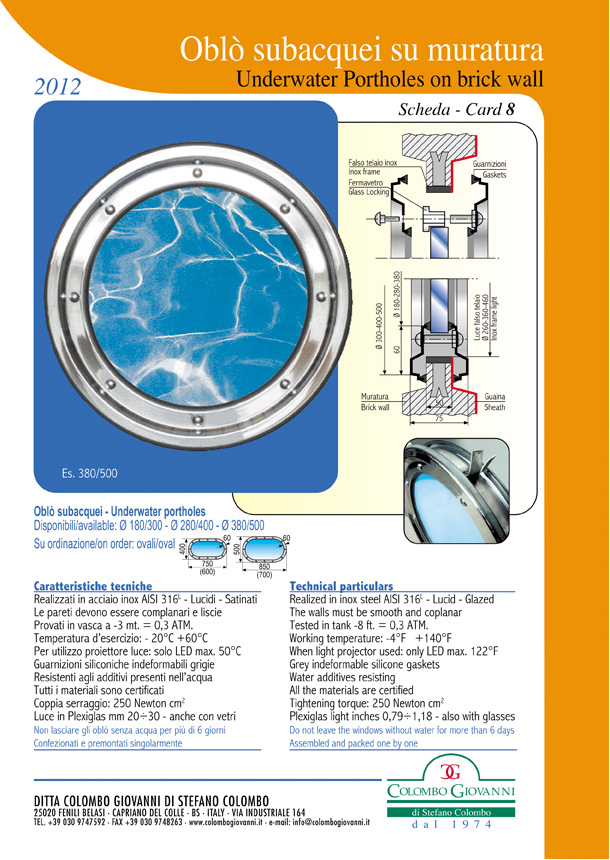 In seinem Werk in Brescia (in Fenili Belasi), entwirft das Unternehmen und fertigt Produkte Colombo ständig Verbesserung der Qualität. Da die Gestaltung dieser Bullaugen, ist das Ziel, höchste Kundenzufriedenheit recependone die genauen Bedürfnisse zu erreichen. Dazu können wir das Leben und die Funktionalität dieser herrlichen Bullauge zu garantieren.