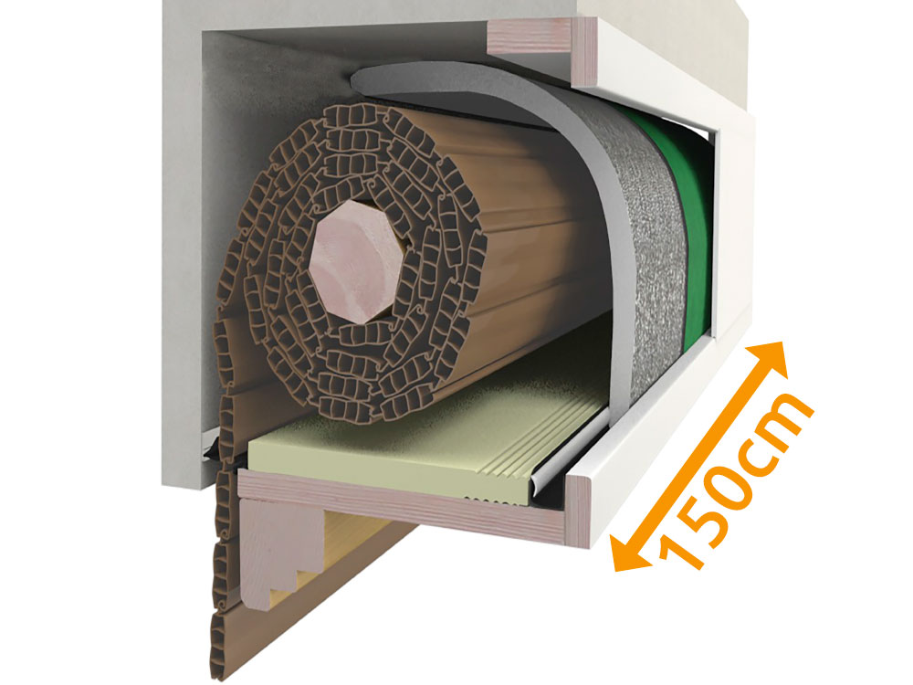 thermoakustischen Isolierung des Rollladenkastens. Für diese Zusammensetzung beträgt die maximale Länge der Box 150 cm (Innenmaß der Box).