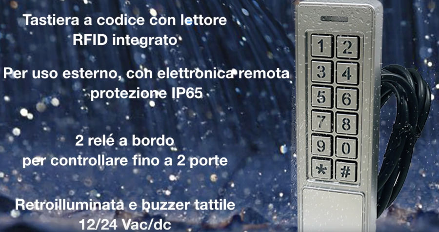 Codetastatur für den Außenbereich, mit Transponderleser. Zwei Freigaben für die Verwaltung von 2 Türen mit Code oder Karte. Separate Elektronik für absolute Sicherheit. Vandalensicher, mit Anti-Manipulationssystem.