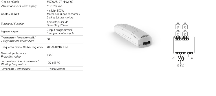 Ausgestattet mit einem integrierten 433,92-MHz-Funkempfänger ermöglicht die Steuereinheit die Speicherung von bis zu 30 Sendern und ist kompatibel mit kabelgebundenen Wettersensoren (Wind, Regen und Sonne), die für automatische Öffnungs- oder Schließvorgänge konfiguriert werden können.