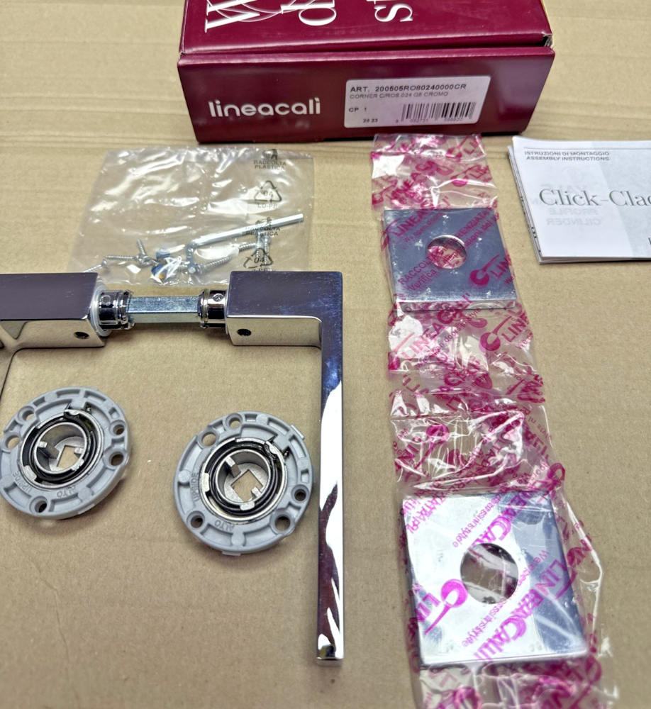 Corner Zincral Basic von Linea Calì ist ein Türgriff auf Rosette mit modernem und minimalistischem Design und einer Oberfläche aus poliertem Chrom, die dem Raum Eleganz und Helligkeit verleiht.