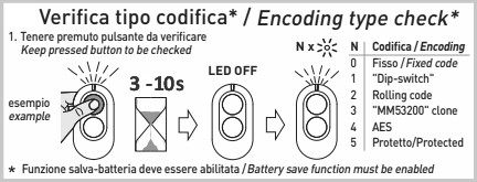die auf der Ditec Zen-Fernbedienung eingestellte Art der Codierung zu überprüfen , halten Sie die Steuertaste 3-10 Sekunden lang gedrückt, bis die rote LED zu blinken beginnt. Als nächstes müssen Sie die Blitze der LED zählen und mit der Tabelle des Herstellers vergleichen.