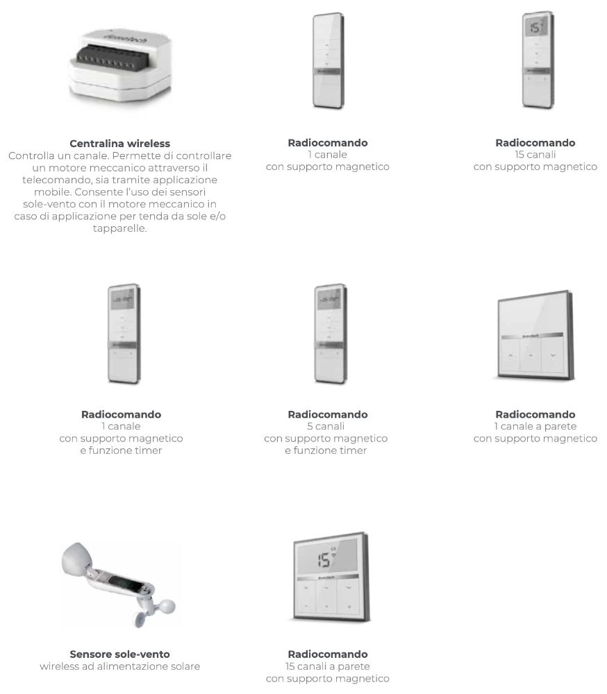 Domotech-Markenkatalog für Motoren für Rollläden und Markisen umfasst mechanische, Funk- und elektronische 3-Stop-Motoren sowie Fernbedienungen, Steuereinheiten, Wi-Fi-Hubs, Sonnen- und Windsensoren und Montagezubehör.