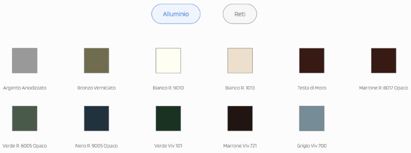 Farbpalette: Der Moskitonetzhersteller Officine Rami bietet eine große Auswahl an Stofffarben (wählen Sie die gewünschte Variante). Die in diesen Tabellen dargestellten Farben haben rein indikativen Wert und können keinesfalls als Referenzfarben für etwaige Farbunterschiede im Vergleich zu den tatsächlichen Farben angesehen werden.