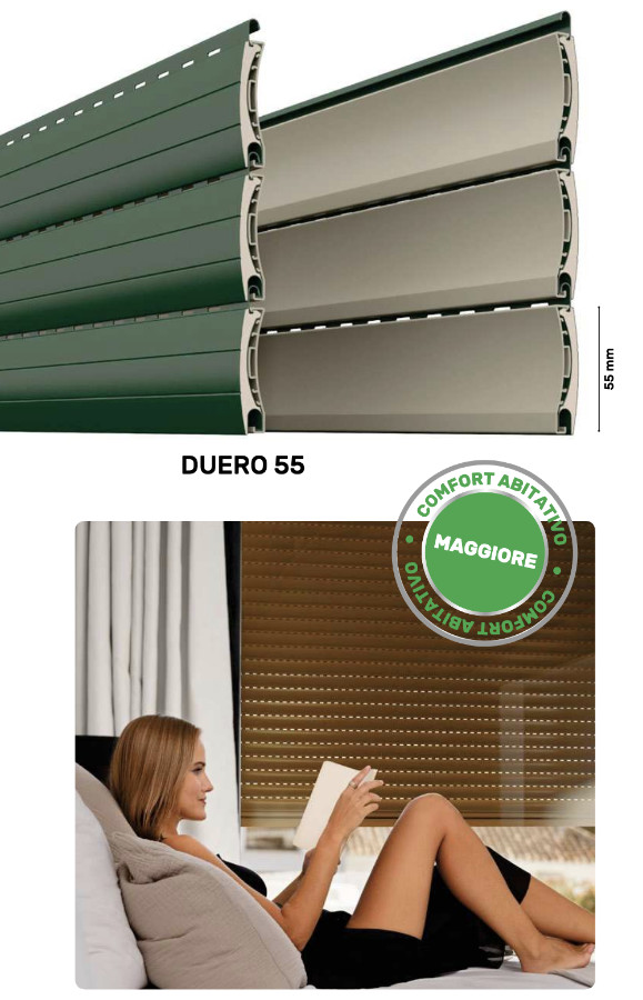 Duero55 besteht aus einem Aluminium-Rollladenprofil mit Zwischenschaltung aus Polyurethanschaum, das durch Ineinandergreifen mit einem selbstverlöschenden PVC-Profil gekoppelt ist. Der zentrale Spalt zwischen den beiden Materialien schafft eine Bienenstockluftkammer.