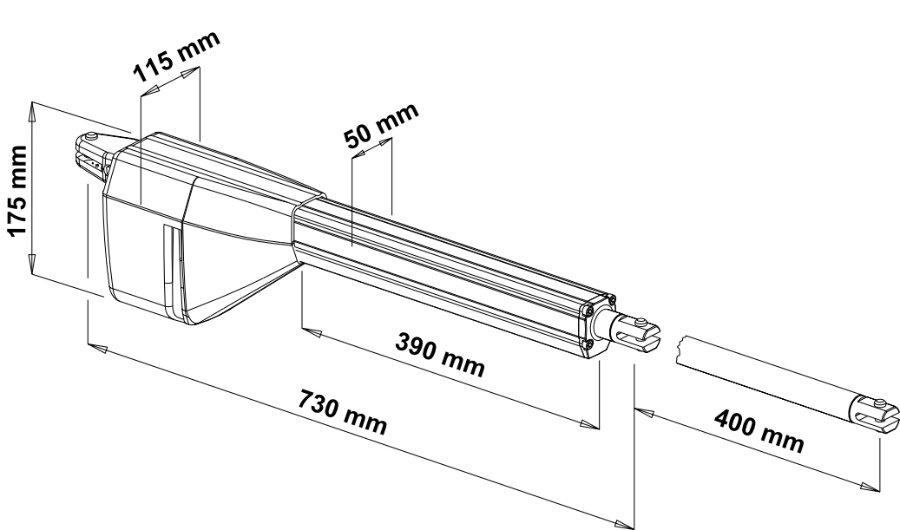 linearer elektromechanischer Antrieb für Drehtore mit einer maximalen Flügelbreite von 3 Metern. Die Spannung beträgt 230 V oder 24 V (Ihre Wahl).