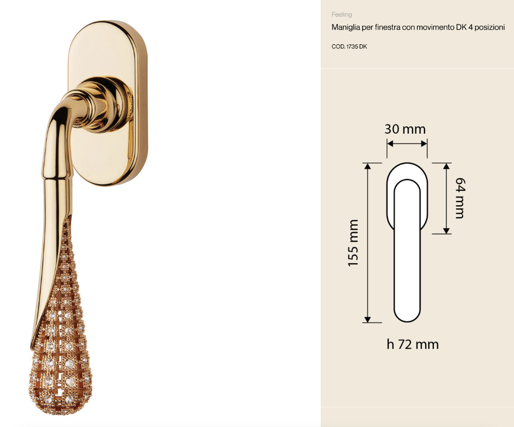 Jeder Griff von Feeling Linea Calì wird vollständig in Italien mit viel Liebe zum Detail und aus hochwertigen Materialien hergestellt. Er ist die perfekte Wahl für alle, die den Fenstern ihres Zuhauses oder exklusiven Räumen wie Hotels und Boutiquen einen Hauch von Luxus und Persönlichkeit verleihen möchten.