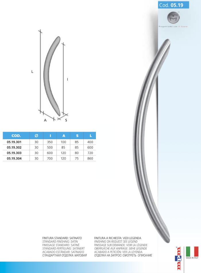 Gebogener Griff aus gebürstetem, poliertem oder lackiertem Edelstahl der Qualität AISI 316L oder AISI 304 (wählen Sie die Variante), Marke MPM Code 05.19.