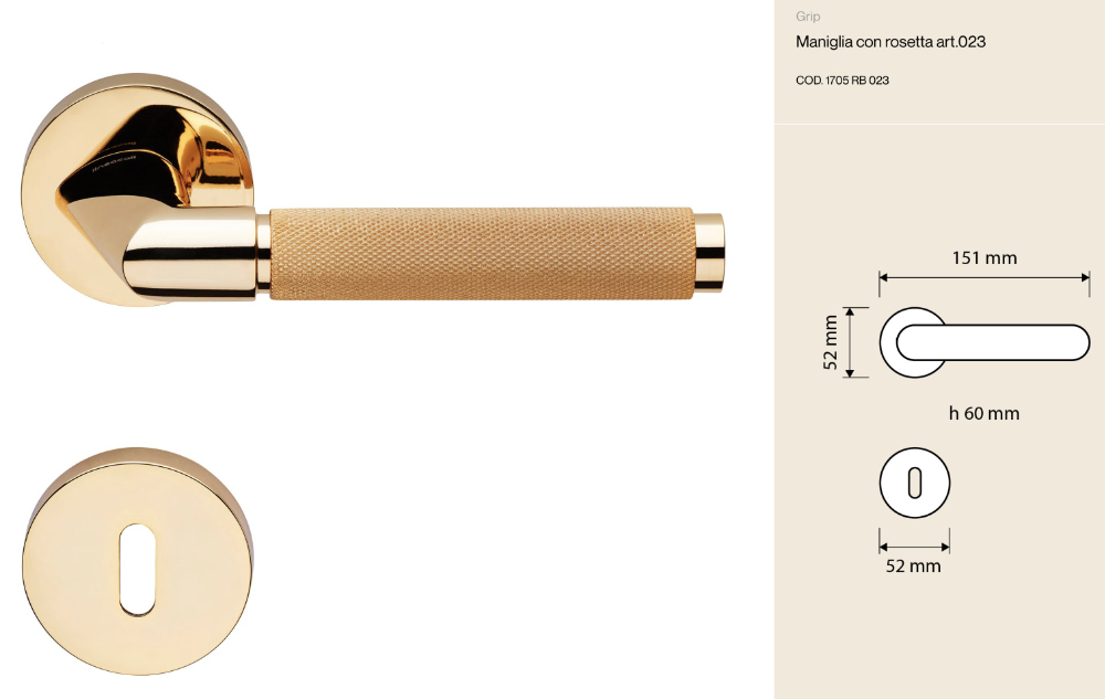 Wie alle Griffe von Linea Calì wird auch die Grip-Kollektion vollständig in Italien im Werk Vobarno (BS) hergestellt und mit der eingravierten Marke versehen, die ihre Echtheit und hohe Qualität bescheinigt.