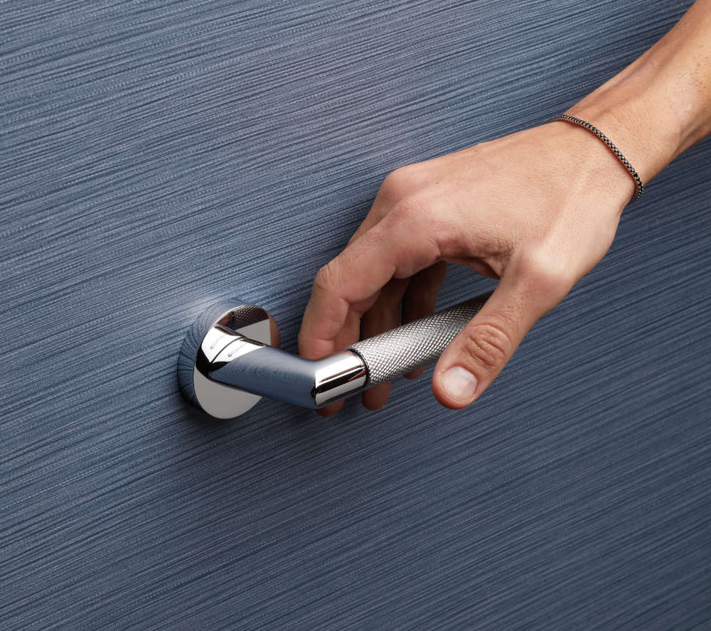 Der Grip ist in verschiedenen Ausführungen erhältlich – von edlem Reingold über technisches Mattschwarz bis hin zu modernem poliertem Chrom – und passt sich jeder Umgebung an, indem er sowohl klassische Pantographtüren als auch minimalistischere und modernere Lösungen vereint.