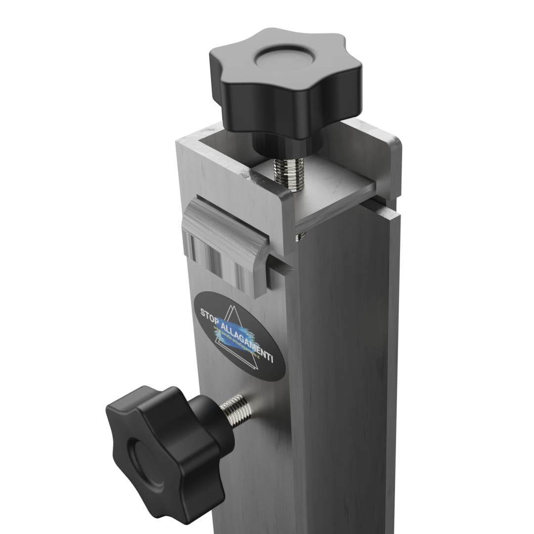 Das System verwendet seitliche Stahlhalterungen mit vertikaler Druckwirkung und eine robuste Holzwerkstoffplatte. So entsteht eine stabile Barriere, die sich an verschiedene Öffnungen anpassen lässt. Die Halterungen werden an den Seiten der Öffnung befestigt. Bei Bedarf wird die Platte eingesetzt und durch vertikalen Druck fixiert.