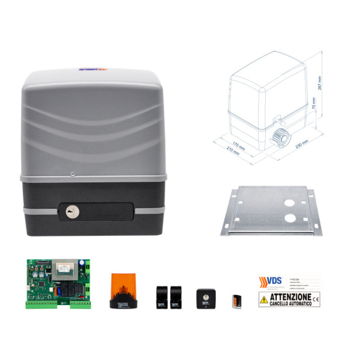 SIMPLY VDS-Schiebetorgetriebemotor und alles, was Sie zur Steuerung der Automatisierung Ihres Schiebetors benötigen.