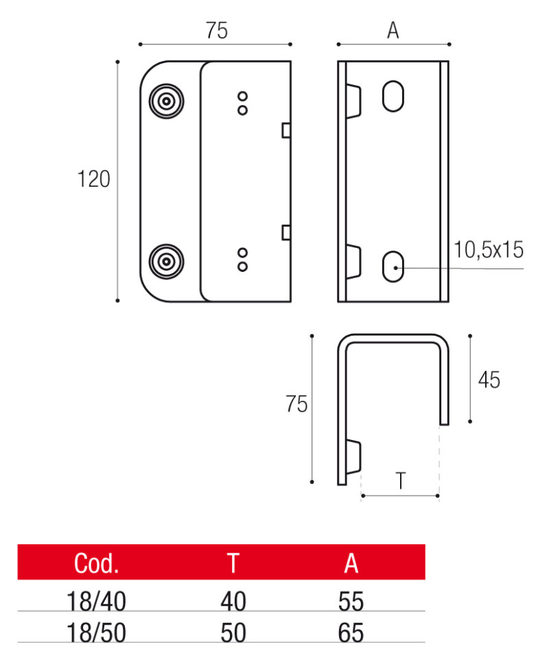 - Code 18/50: Dicke (T) 50 mm, Breite (A) 65 mm, Abstand zwischen den Löchern 6 mm.