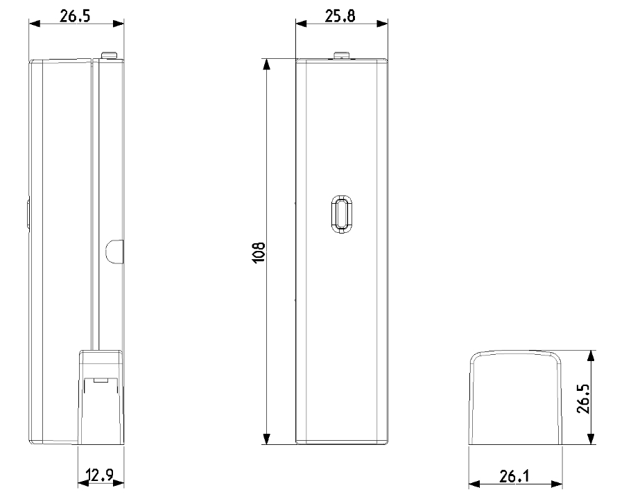 Magnetkontakt und einem Drahtkontakt ausgestattet, die unabhängig voneinander verwendet werden können. Auf der Frontseite befindet sich ein Taster zur Konfiguration und eine zweifarbige rot/blaue LED zur Signalisierung der verschiedenen Zustände. Das Gerät kann mit der View Wireless-App im Bluetooth-System konfiguriert werden und kann über das Gateway 20597-19597-16497-14597 mit der View-App kommunizieren, um das Öffnen oder Schließen eines der 2 Kontakte zu melden.