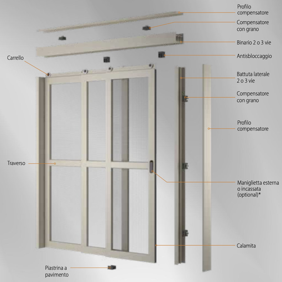 Maya Bettio ist ein Insektenschutzgitter mit horizontal verschiebbaren Paneelen, dessen robuste und widerstandsfähige Struktur perfekt geeignet ist, um sehr große Dimensionen abzudecken.