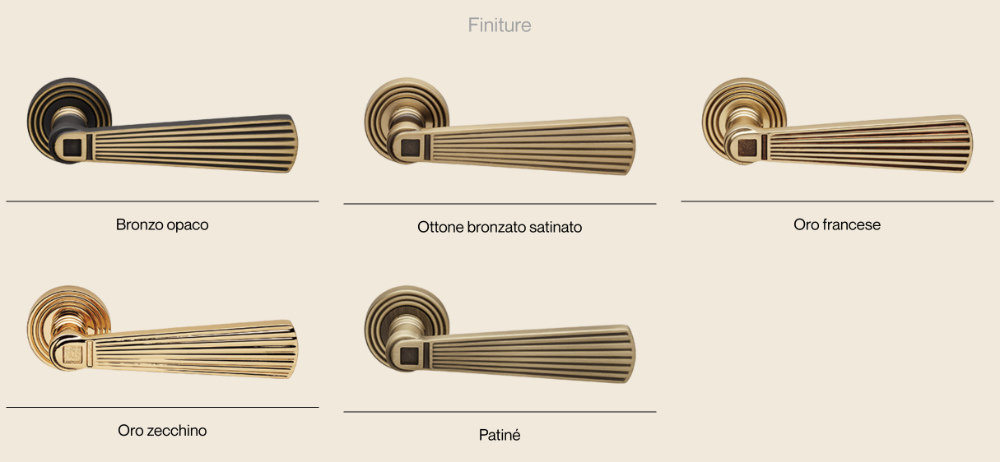 fünf Premium-Ausführungen erhältlich – matte Bronze, satiniertes Bronzemessing, französisches Gold, reines Gold und Patiné – und passt perfekt zu den Griffen und Knöpfen aus der gleichen Kollektion, wodurch eine elegante ästhetische Kontinuität im ganzen Haus entsteht.