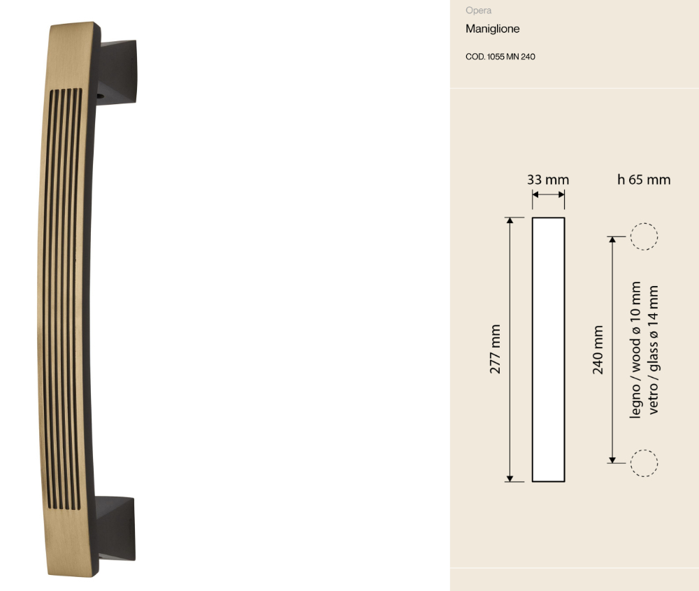 vollständig aus Messing im Handwerkerviertel Brescia gefertigte Griff Opera zeugt von der Liebe zum Detail und der Verarbeitungsqualität, die echte Produkte „Made in Italy“ seit jeher auszeichnen. Die präzise, klar definierte Rillenoberfläche unterstreicht die Festigkeit des Metalls und erzeugt ein Spiel aus Licht und Schatten, das seine Tiefe und Eleganz verstärkt.