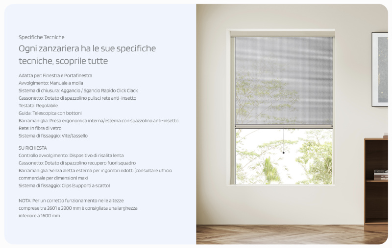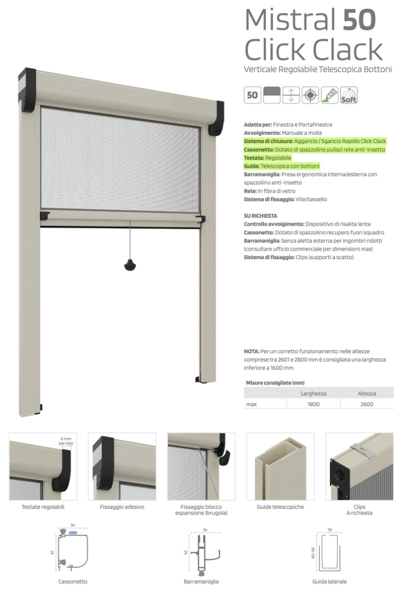 Vertikales Fliegengitter für Fenster – Officine Rami Mistral 50 Click Clack – verstellbarer Kopf und Teleskopführung mit Knöpfen