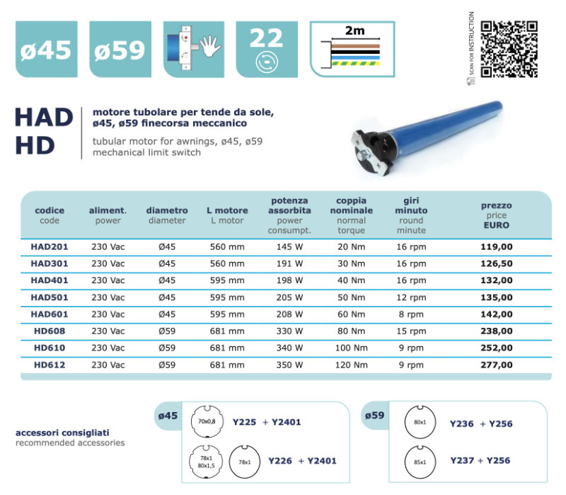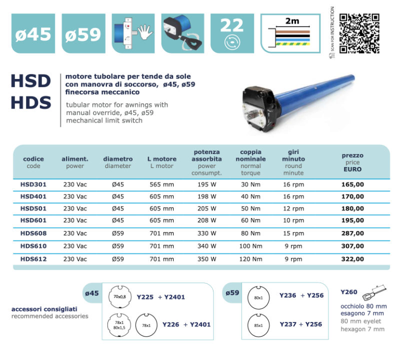 HSD401 (40 Nm) - HSD501 (50 Nm) - Rohrmotor für Markisen mit Notbetrieb, ø45, ø59 mechanischer Endschalter