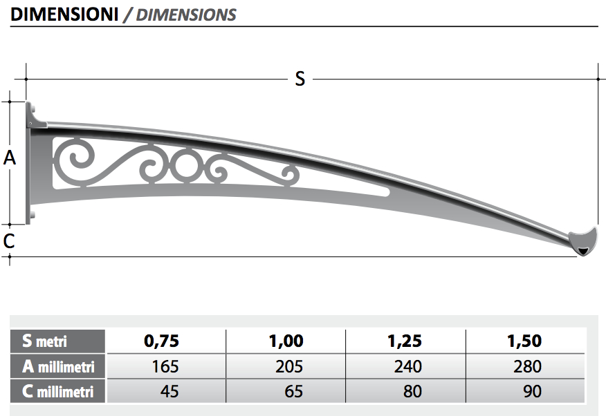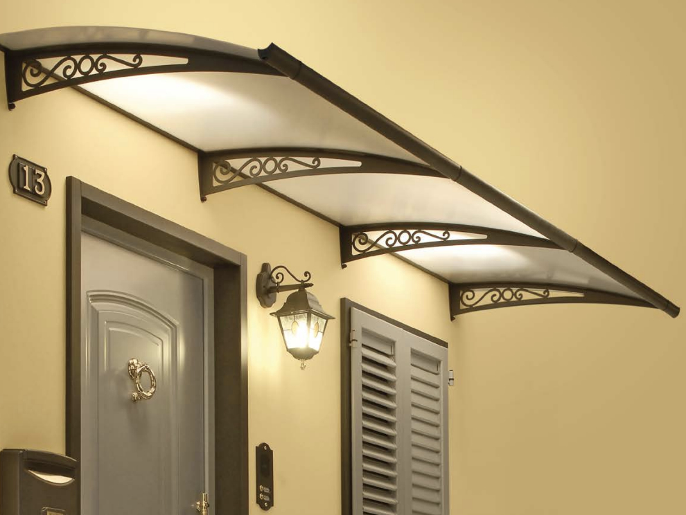 Vordach mit einer Belastung von 200 kg / m (unter den Testbedingungen, wie durch ISTEDIL zertifiziert), erhältlich in Standardgrößen und maßgeschneiderte, mit:
