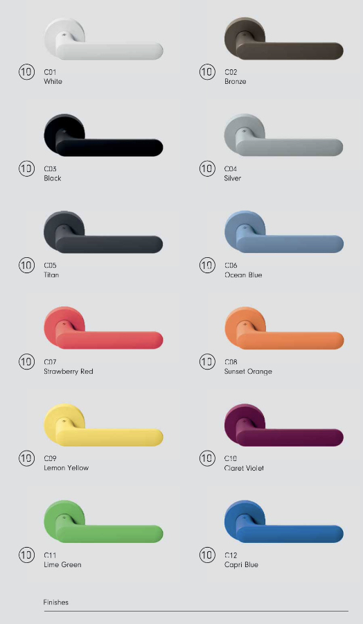Die Colombo Design Mood-Kollektion bietet Griffe und Accessoires in einer Vielzahl von Farbausführungen, die sich an unterschiedliche Stile und Umgebungen anpassen. Die umfangreiche Farbpalette ermöglicht die individuelle Gestaltung jedes Details und verwandelt den Türgriff in ein dekoratives Element.