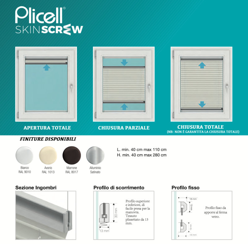 - Plicell Skin Screw ist das Plissee mit 13 mm plissiertem Stoff;
