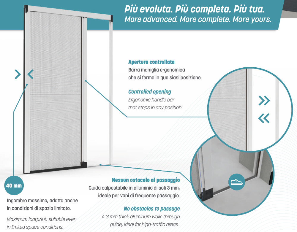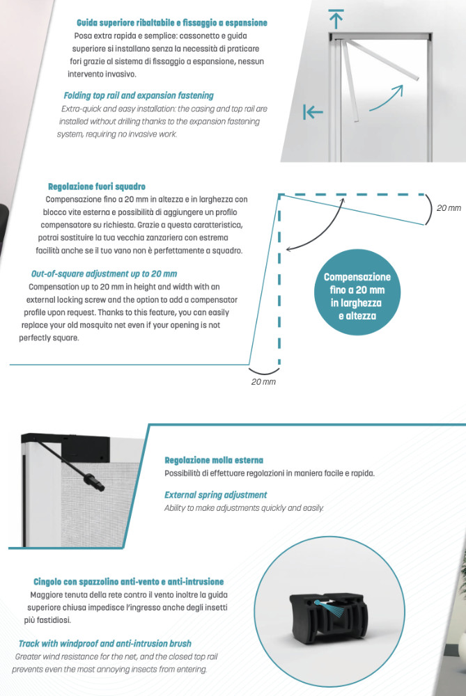 Die gebürstete Führungsschiene sorgt für eine bessere Stabilität des Netzes auch bei windigen Bedingungen, während die geschlossene obere Führung einen wirksamen Schutz gegen das Eindringen von Insekten bietet, selbst der kleinsten und lästigsten.