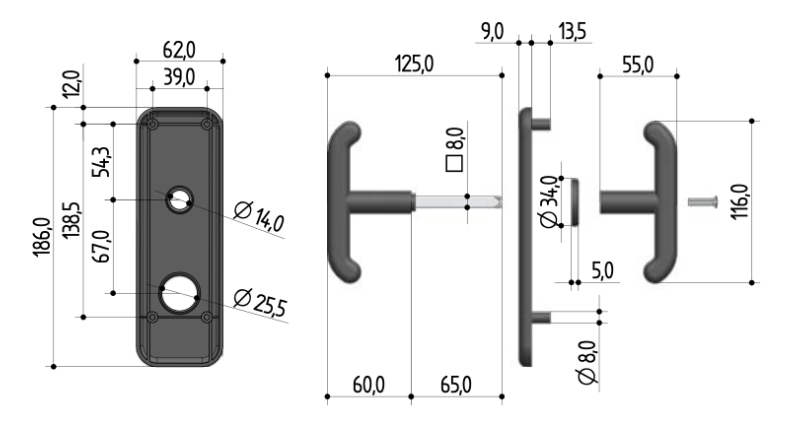 Prefer 0432 Schwingtürgriff, Platte für Rundzylinder, 8mm Vierkant und Maße laut technischer Zeichnung.