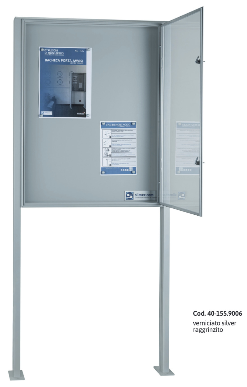 Die selbsttragende Pinnwand ist in drei verschiedenen Versionen erhältlich, sowohl für die Innen- als auch für die Außenmontage, und wird mit vier silbernen Magnet-Kits für insgesamt sechzehn Magnete geliefert. Öffnung mit Doppelschloss mit Schlüssel (um ein Öffnen ohne Schlüssel zu verhindern) oder mit Doppelflügelschloss (kann von jedermann geöffnet werden).