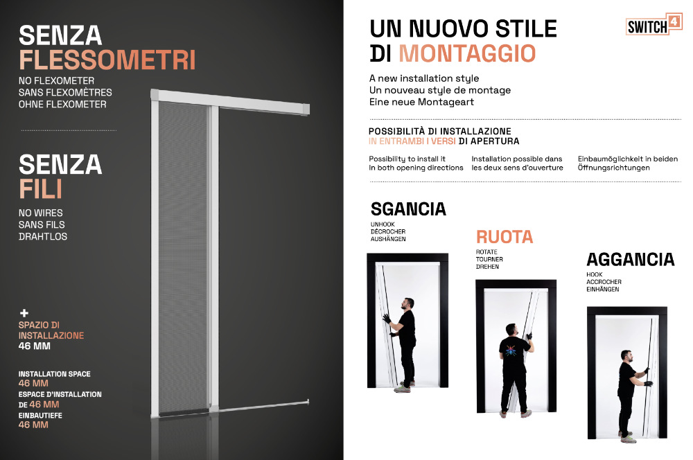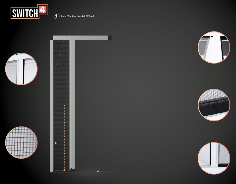 Switch4 ist das Insektenschutzgitter für Eingänge, die ein robustes, elegantes und geräuscharmes Produkt erfordern. Dank einer umfassenden Auswahl an Kompensatoren (optional auf Anfrage): Einzel- oder Doppelprofile, magnetisch oder nicht-magnetisch, die am Gehäuse oder Anschluss positioniert werden können, lässt es sich optimal an die jeweilige Öffnung anpassen. Mit diesem Zubehör können Sie Ungenauigkeiten und Lochtoleranzen ausgleichen und so stets eine perfekte Abdichtung gewährleisten.
