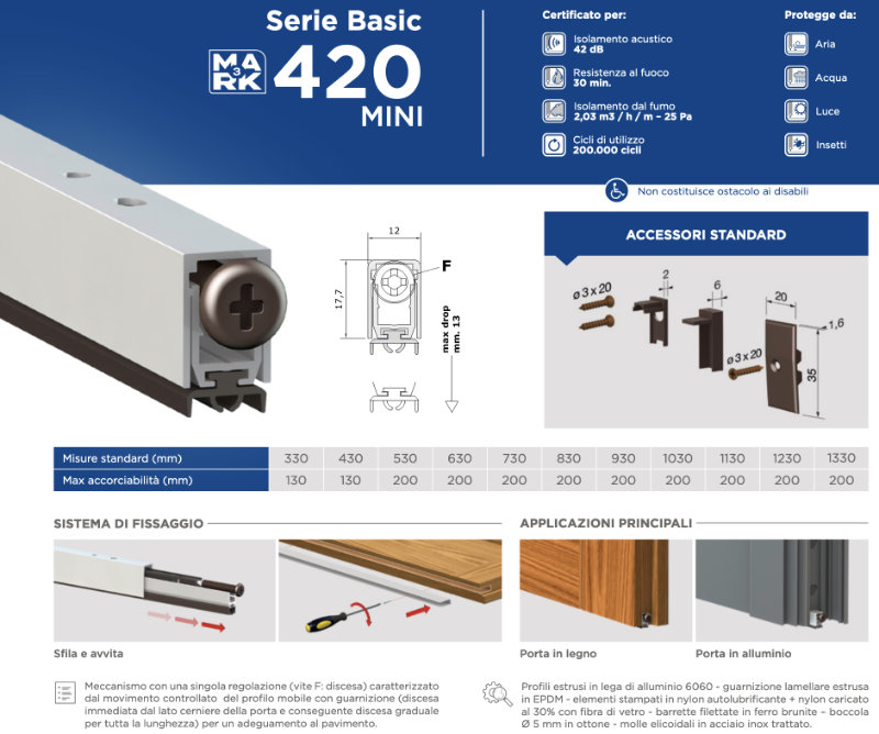 Zugluftstopper der Serie Comaglio 420 Mini Basic ist eine praktische und effektive Lösung zur Verbesserung der Isolierung Ihres Hauses. Dank seines patentierten automatischen Mechanismus blockiert es das Eindringen von Kälte, Staub und Lärm beim Schließen der Tür und schafft so eine komfortablere und geschütztere Umgebung.